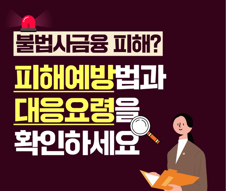 - 계약서, 입출금 내역, 통화·문자 기록 등은 불법사금융 피해의 증거가 됩니다. 피해 사실을 금융감독원(☎1332→3번) 또는 경찰서(☎112)에 신고하십시오. 피해 신고가 구제와 예방의 첫걸음입니다.