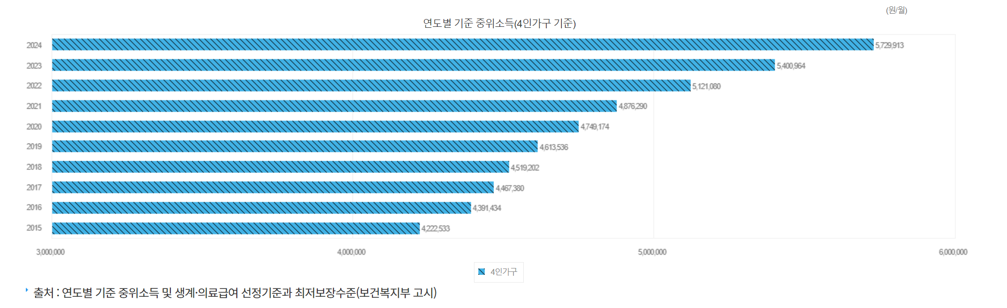 4인가족 기준으로 연도별 중위소득이 어느정도인지 가늠해볼 수 있는데요.