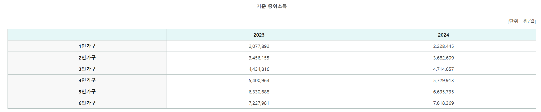 가구당 중위소득은 어떻게 되는지 알아보겠습니다. 자신이 해당하는 가구수가 몇 명인지 확인하고 아래 표를 확인 해보시면 됩니다.